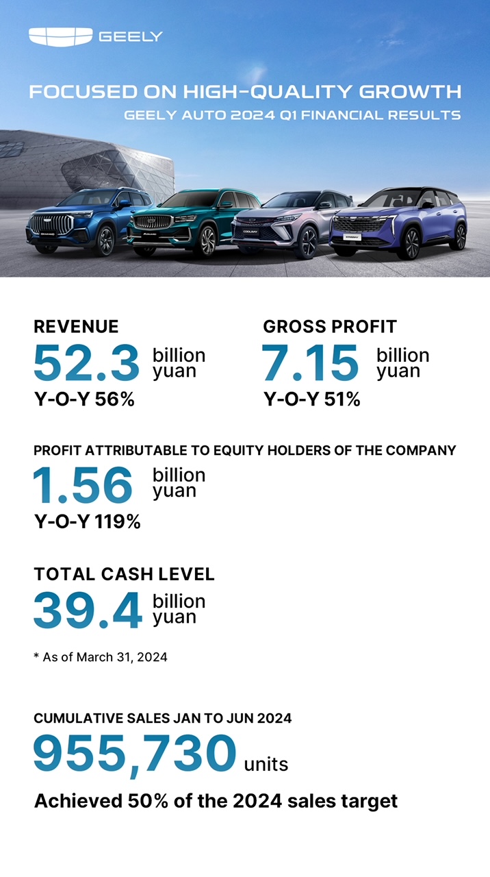U automobilskoj industriji koja se neprestano razvija, Geely ostaje u svojoj srži razvoja visoke vrijednosti, optimiziranja asortimana proizvoda i povećanja učinkovitosti rada. Tijekom prvog tromjesečja, bruto dobit Geely Auto Grupe iznosila je 7,15 milijardi juana, što je značajan porast od 51% u usporedbi s prvim kvartalom 2023. Geely Auto postigao je brzi rast prihoda i dobiti, osiguravajući solidan novčani tok za povećanje vrijednosti proizvoda i kvalitete usluge. Od 31. ožujka 2024. ukupna razina gotovine Geely Auto dosegla je 39,4 milijarde juana.