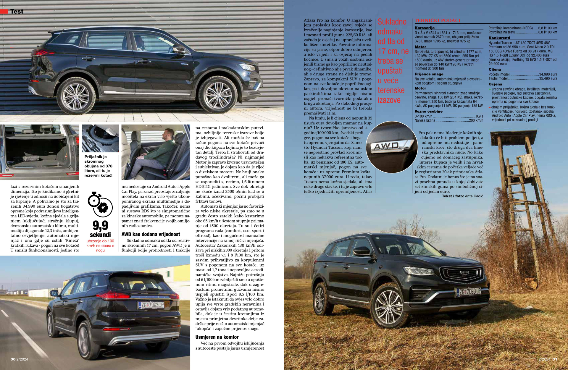Na kraju, je li cijena od nepunih 35 tisuća eura dovoljan mamac na kupnju? Uz tvorničko jamstvo od 4 godine/100.000 km, švedski pedigre, pogon na sve kotače i bogatu opremu, vjerojatno da. Samo što Hyundai Tucson, koji nam se neprestano provlači kroz misli kao nekakva referentna točka, uz benzinac od 180 KS, automatski mjenjač, pogon na sve kotače i uz opremu Premium košta nepunih 37.000 eura. U redu, takav Tucson nema kožna sjedala, ali ima neke druge stavke, i tu je zapravo vrlo teško izjednačiti opremljenost. Atlas Pro pak nema hlađenje kožnih sjedala što će biti problem po ljeti, a od opreme mu nedostaje i panoramski krov, što druga dva kineska predstavnika nude. No kako čujemo od domaćeg zastupnika, interes kupaca je velik i na hrvatskim cestama do početka veljače već je registrirano 20-ak primjeraka Atlasa Pro. Dodatni je bonus što je na snazi posebna ponuda u kojoj dobivate set zimskih guma po simboličnoj cijeni od jedan euro.